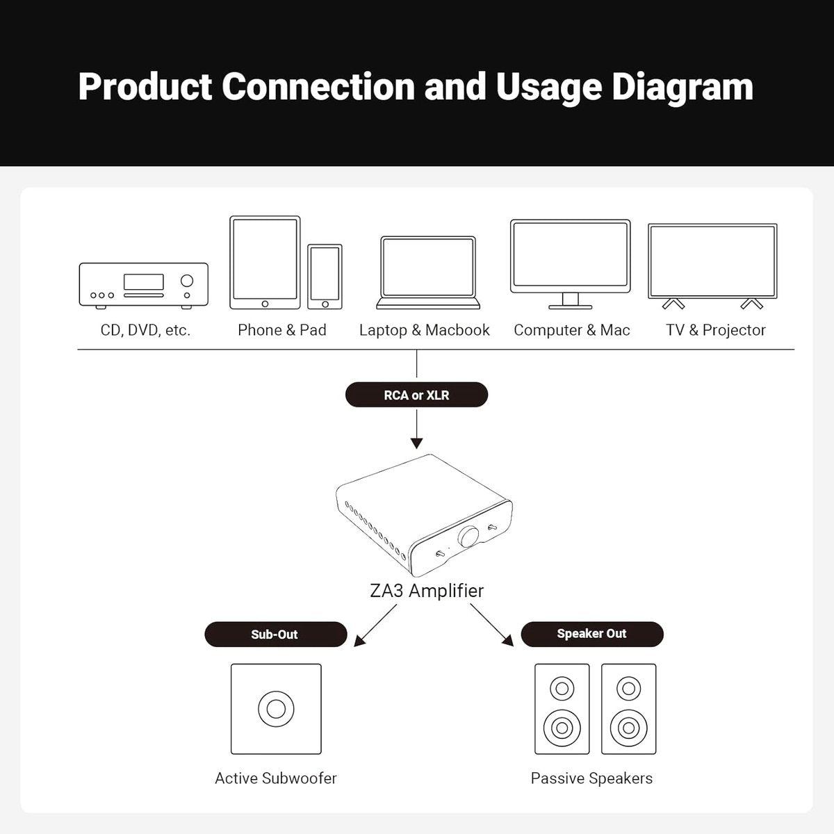 Fosi Audio ZA3 Amplificateur HiFi Stéréo/Mono – Entrées XLR et RCA Équilibrées – avec Déclencheur 12V