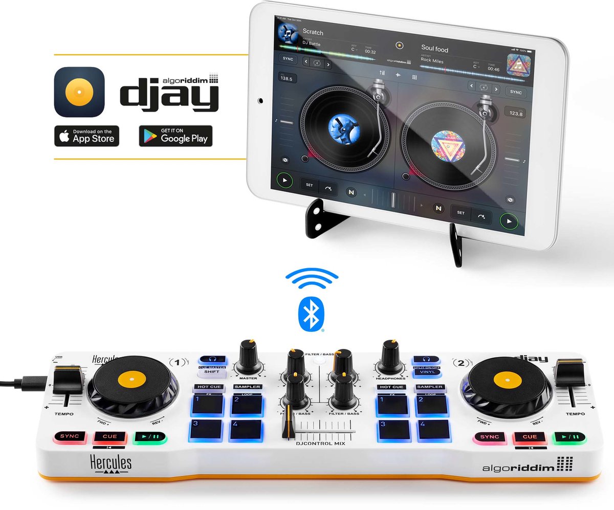 Détails: DJControl Mix fait pour les smartphones iOS et Android : il se connecte au smartphone sans fil en Bluetooth Smart et pilote l’app djay du smartphone iOS et Android. Sa taille (34x10cm), son poids (<0,5 kg) et son design sont parfaits pour les smartphones, d’autant qu’il est livré avec un socle pour smartphone et s’alimente par câble USB sur des alimentations USB (non fournies) ou des batteries USB/PowerBank (non fournies).DJControl Mix permet d’apprendre à mixer : sa latence ultra-courte, ses contrôles précis (jog wheels et faders) et nombreux (pads, volumes et filtres) permettent aux DJs de faire les mêmes gestes que sur du matériel DJ professionnel. Le DJ peut diffuser son mix sur des enceintes Bluetooth connectées au smartphone, sur la sortie casque du smartphone ou sur le haut parleur interne du smartphone.